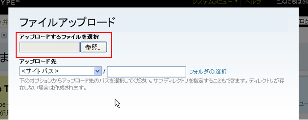 アップロードファイル選択右側にある参照をクリックします