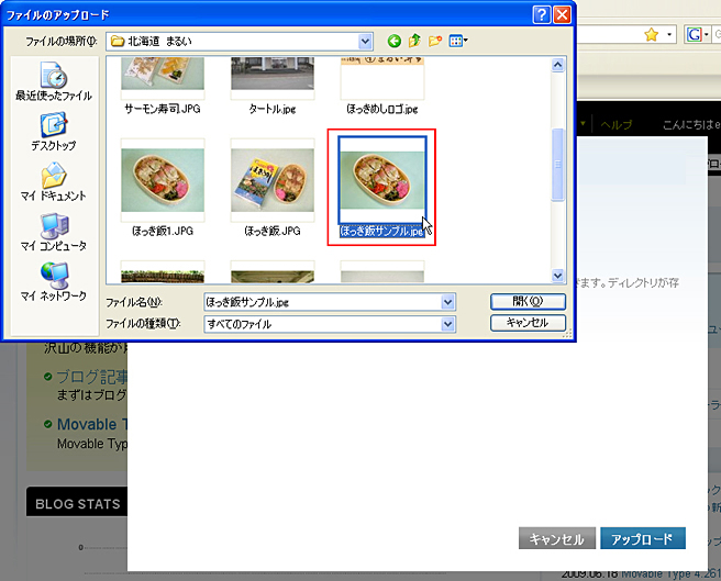 PCに保存されている弁当画像を探しだし、画像を選びます。フォルダの開くをクリック
