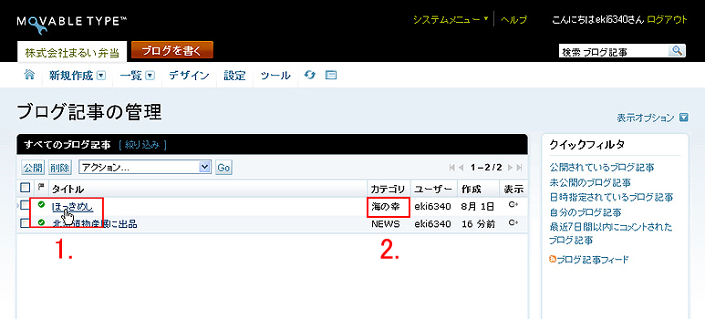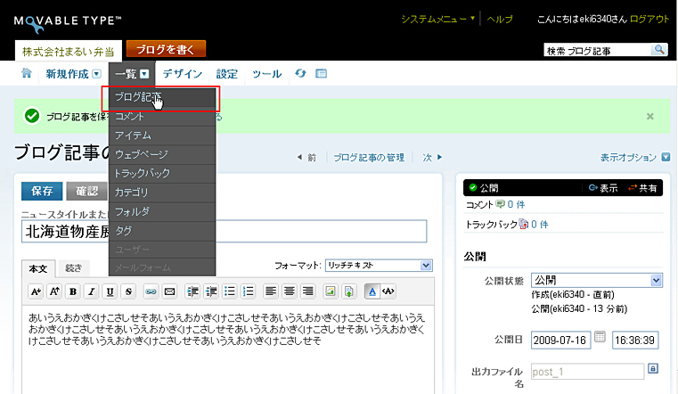 1.投稿データを修正したい場合はそのタイトルをクリックします。「ブログ記事の編集」画面へ遷移しますので、内容を訂正して登録ボタンをクリックします。